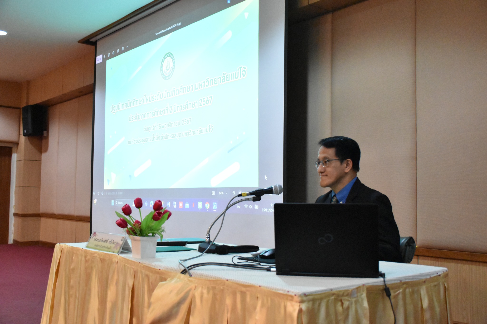 วันศุกร์ที่ 15 พฤศจิกายน 2567 รองศาสตราจารย์ ดร.เกรียงศักดิ์ ศรีเงินยวง รองอธิการบดีมหาวิทยาลัยแม่โจ้ กล่าวต้อนรับนักศึกษาระดับปริญญาโทและปริญญาเอก ในโครงการปฐมนิเทศนักศึกษาใหม่ระดับบัณฑิตศึกษา มหาวิทยาลัยแม่โจ้ ประจำภาคการศึกษาที่ 2/2567 โดยมี ผู้ช่วยศาสตราจารย์ ดร.สนิท สิทธิ ผู้อำนวยการสำนักบริหารและพัฒนาวิชาการกล่าวรายงาน ทั้งนี้การปฐมนิเทศดังกล่าวจัดขึ้นเพื่อเป็นการสร้างความเข้าใจเกี่ยวกับการเรียนการสอนในระดับบัณฑิตศึกษา โดยมีการบรรยายเกี่ยวกับ “แนวทางการจัดการเรียนรู้เพื่อพัฒนาผู้เรียนระดับบัณฑิตศึกษา